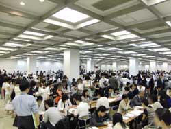 | 予約校当日受付コーナー。順番を待つ人で溢れていました。 | 予約校当日受付コーナー | 総合相談コーナーの様子。多くの塾が席を設けており、相談することができます。 |